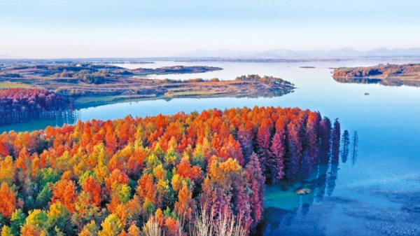 深秋时节,漫步市区富强公园,碧空如洗、水清岸绿,几只野鸭在湖面嬉戏,一队骑行爱好者的笑声掠过草丛,一幅城市与自然和谐共处的生态文明画卷徐徐铺展。