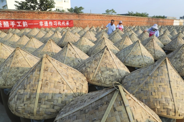 晒场上,大伙分工明确,装缸、加曲、搅拌、用特制泥巴封缸……汗珠砸在水泥地上瞬间蒸发。“越热越出好醋!”50多岁的非遗传承人、厂长翁泽彬抹了把汗,指着整齐排列的醋缸说。今年头伏,他们一口气新增了1000多口缸,总数突破3000缸。工人们三班倒,日夜不停地煮料、搅拌,最后用当地特制的泥巴仔细封缸,盖上篾盖。