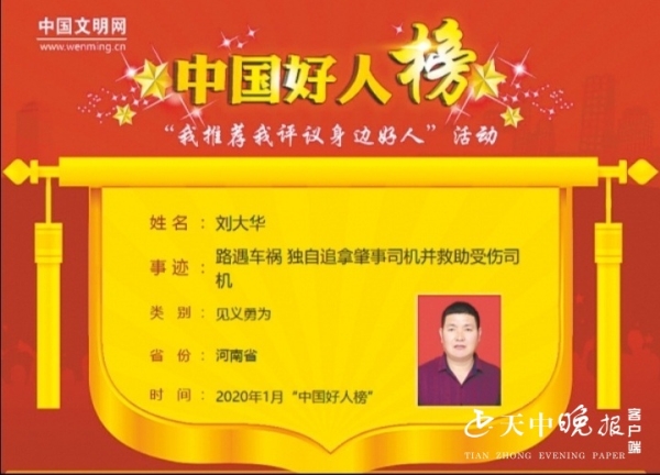 据了解,刘大华是上蔡县蔡沟镇中陈村村民,在2020年,中央文明办主办的“我推荐我身边好人”活动中,荣登“中国好人”榜。 |