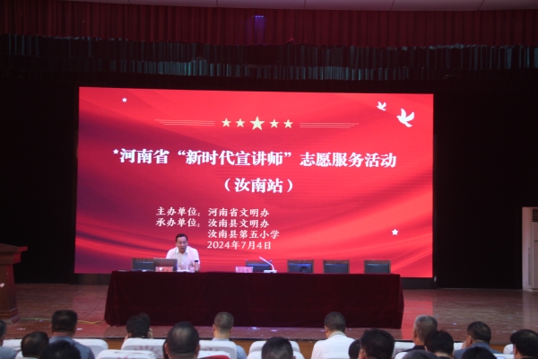 7月4日下午,由河南省文明办主办,汝南县文明办、汝南县第五小学承办的2024年河南省“新时代宣讲师”志愿服务活动在县第五小学报告厅举行。县委常委、宣传部部长、副县长王文斌主持活动。