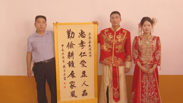 婚礼现场,热闹非凡,许多人抱着好奇的心态来围观这对新人。“真的没有给彩礼吗?”“是不是给其他的了?”“在县城买房买车了吗?”……面对大家七嘴八舌的询问,新郎的父亲张卫红边笑边摆手,“真的没有给彩礼,就给媳妇买了‘三金’,一条项链、一对耳钉和一枚戒指。” 谈及为何会做出“零彩礼”这一决定,新娘苏静怡说:“从俺俩奔着要结婚的时候,就有这个想法了,一开始初衷是不想增加男方的经济负担,俺俩是自由恋爱,两家也都是普通的家庭,高额的彩礼可能会增加俺俩婚后生活的负担。俺爸妈也是自由恋爱嘛,他俩在一起20多年了,也没有因为生活琐事吵过嘴,我希望把这种好家风传承下去。我觉得爱应该体现在日常生活中,不应该通过彩礼来体现。” 婚礼前一天,县文明办、县民政局、妇联会等单位负责同志前往苏争光、刘现利夫妇家中,为其颁发了“婚俗新风模范家庭”荣誉证书,引导广大群众树立正确的婚姻观念,摒弃高额彩礼等不良习俗。