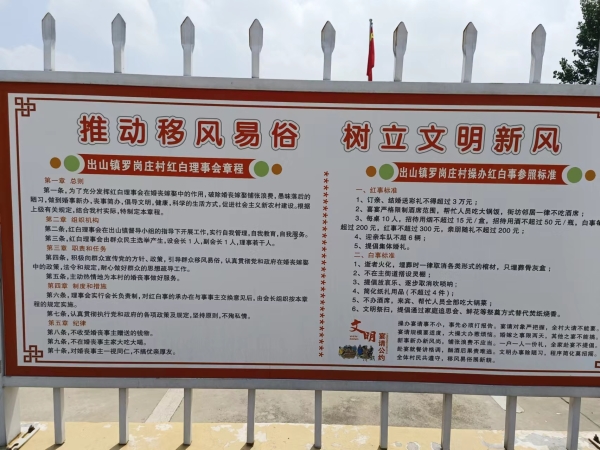 同时,西平县通过集中宣讲会、板凳会等形式,利用文明网、公众号线上宣传、张贴标语等方式进行广泛宣传、动员,提高群众知晓度、认可度;制作《移风易俗宣传图册》《西平县市民文明手册》及各类宣传画,以通俗易懂的手法倡导文明婚俗。坚持教育引导。发挥各村(居)党员干部、基层网格员、“五老”人员作用,组织开展移风易俗工作群众满意度调查,逐户进行面对面宣传、引导,帮助群众树立“喜事新办、丧事简办”的意识;组织西平县民政局、司法局工作人员,开展宣讲民法典有关规定、案例讲解、法律咨询等活动120余场,以高额彩礼现状为切入点,引导群众自觉抵制高额彩礼等不良风气,倡导健康文明的婚嫁观念。坚持典型带动。挖掘在文明婚俗工作中涌现的好典型,在“5·20”“七夕”等特殊节点,邀请“西平好人”、优秀志愿者等人士为新人颁证,用身边人、身边事教育群众,使移风易俗工作真正入脑、入耳、入心。 加强组织引领,共树文明新风 完善“一约四会”。西平县280个村(社区)推动红白理事会、村民议事会、道德评议会等群众组织健全完善组织章程和各项制度,对操办婚丧事宜等提出具体约束性措施。强化党员带头。党员干部以身作则引领社会风尚,严格实行党员干部操办婚丧喜庆事宜报告制度,签订移风易俗承诺书。柏城街道的党员、群众目前已签订承诺书7600余张,党员干部婚丧报备65人次;柘皋镇结合本地风俗习惯,针对红白喜事操办范围、人情礼金等予以上限约定,每人婚礼礼金不超过300元。组织志愿劝导。西平县各镇(街)共成立抵制高额彩礼志愿劝导队304支,通过实地走访、微信群转发等线上线下相结合的形式,为居民讲解红白喜事操办标准、操办内容、宴请范围、随礼标准等具体事宜,实现“抵制高额彩礼 倡导文明婚俗”宣传全领域、广覆盖,潜移默化改变广大群众的陈旧观念。